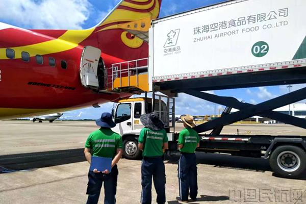 工作人员正在给航班送餐