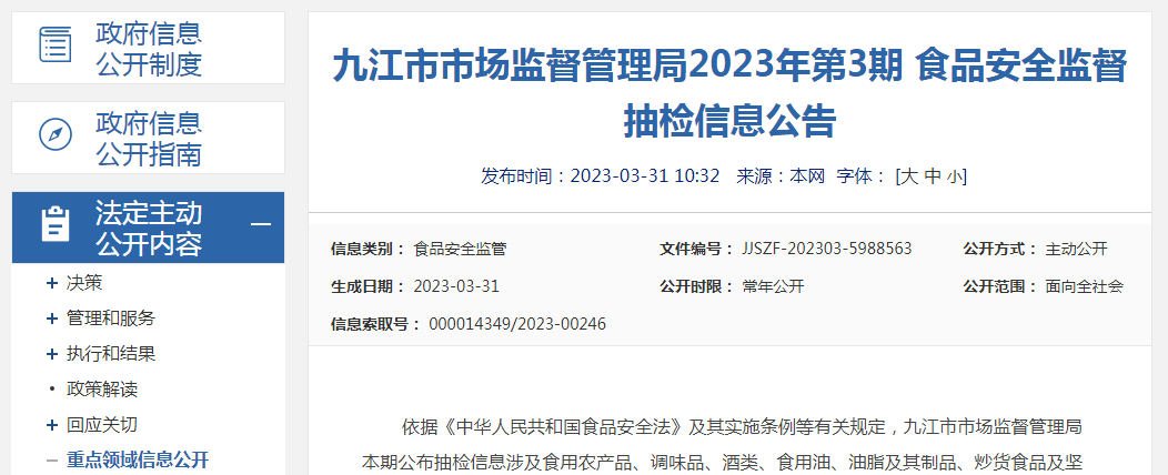 中国质量新闻网讯 2023年3月31日,江西省九江市市场监督管理局网站发布2023年第3期食品安全监督抽检信息公告。